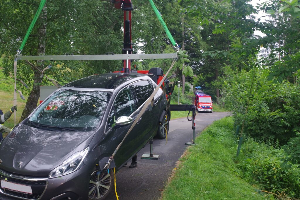 Mittwochvormittag fuhr ein Pensionist in Eisenberg an der Raab mit seinem PKW in Richtung Sankt Martin an der Raab. Bei einer Linkskurve kam der PKW von der Fahrbahn ab und schlitterte die steile Straßenböschung hinter, bis er im Unterwuchs eines Jungwaldes steckenblieb. Ein entgegenkommender Autofahrer half dem beim Unfall unverletzt gebliebenen Mann aus seinem PKW. Die Feuerwehren von Sankt Martin an der Raab, Eisenberg an der Raab und Jennersdorf hoben den nur leicht beschädigten PKW mit einem LKW-Ladekran wieder zurück auf die Fahrbahn.