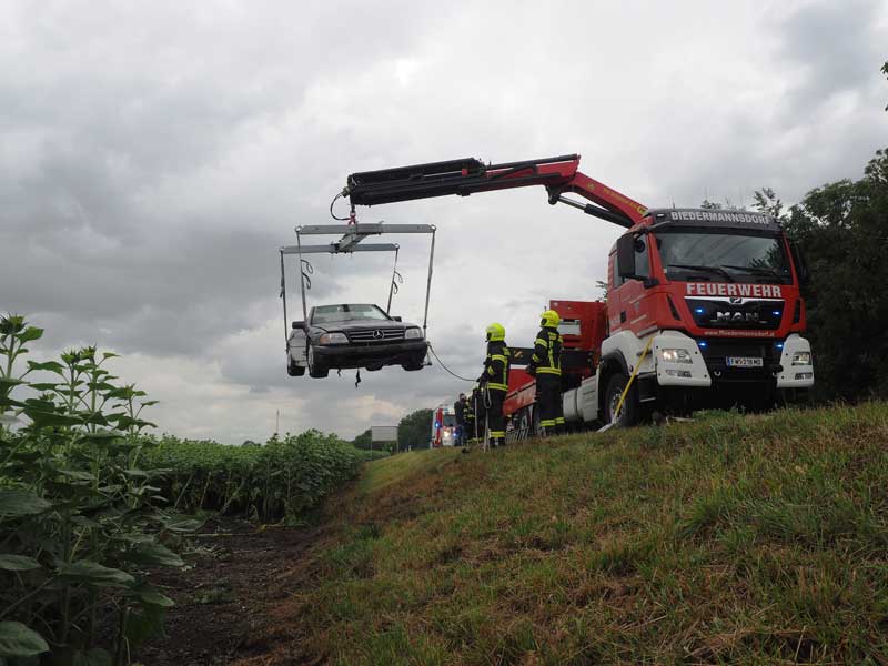 In den Nachmittagstunden des 10.07.2025 verlor ein Lenker auf der regennassen Fahrbahn der L 154 bei einer Probefahrt die Kontrolle über sein Fahrzeug, fuhr über die Böschung und kam in einem Sonnenblumenfeld zu stehen.Von den Einsatzkräften wurde aufgrund des verursachten Flurschadens die Polizei beigezogen, das Fahrzeug mit dem Ladekran geborgen und abtransportiert.