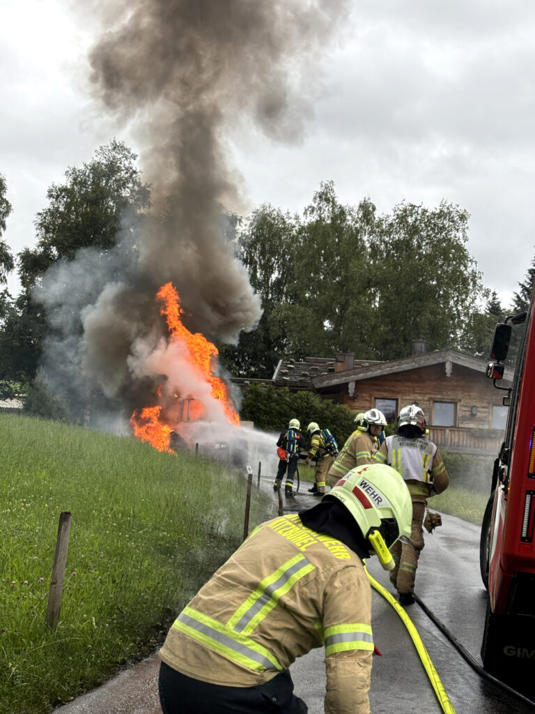 Am Montag, dem 28. Juli 2025, wurde die Stadtfeuerwehr Kitzbühel um 09:30 Uhr zu einer Ölspur im Stadtgebiet alarmiert. Während der Arbeiten zur Beseitigung der Verunreinigung erfolgte um kurz nach 10:00 Uhr eine weitere Alarmierung zu einem Fahrzeugbrand – ein Traktor stand in Vollbrand. Die laufenden Tätigkeiten wurden unterbrochen, die Mannschaft rückte umgehend zur neuen Einsatzstelle aus. Vor Ort wurde ein umfassender Löschangriff unter Atemschutz mit mehreren Strahlrohren durchgeführt. Das Brandobjekt wurde zusätzlich mit Netzmittel benetzt, um den Löscherfolg zu beschleunigen. Auslaufende Betriebsmittel wurden umgehend gebunden – ein Einfließen in angrenzende Bäche konnte erfolgreich verhindert werden. Das Fahrzeug wurde von der Fahrbahn entfernt, für die Dauer des Einsatzes war die einspurige Straße gesperrt. Nach Abschluss der Löscharbeiten wurde auch die unterbrochene Ölspur im Stadtbereich vollständig abgearbeitet und die Verkehrsflächen entsprechend gereinigt. Der Brand war nach rund 45 Minuten unter Kontrolle, das Einsatzende für beide Einsätze erfolgte nach etwa 2 Stunden.