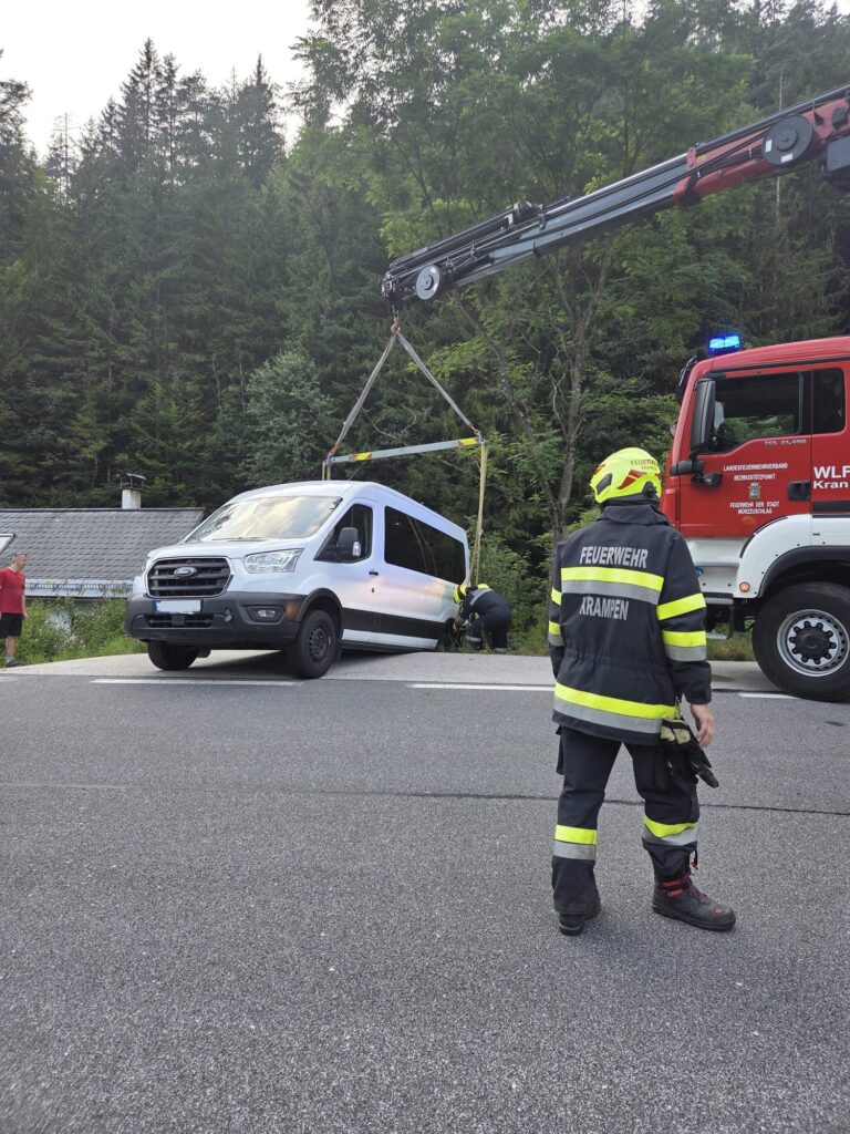 Am Donnersteg, 14.08.2025 wurden die Einsatzkräfte der Freiwilligen Feuerwehr Krampen um 18:20 Uhr mittels Sirenenalarm zu einer Fahrzeugbergung auf die B23 gerufen. Ein PKW ist bei einem Wendevorgang von der Straße abgekommen und auf der Bodenplatte aufgelegen und konnte aus eigener Kraft nicht mehr weiterfahren. Die Feuerwehr brachte das Fahrzeug mittels Kran wieder auf die Straße zurück. Eingesetzt war die FF-Krampen mit 12 Einsatzkräfte und KLF-A und LKW-A, sowie das WLF-K mit 3 Einsatzkräfte der FF Mürzzuschlag.