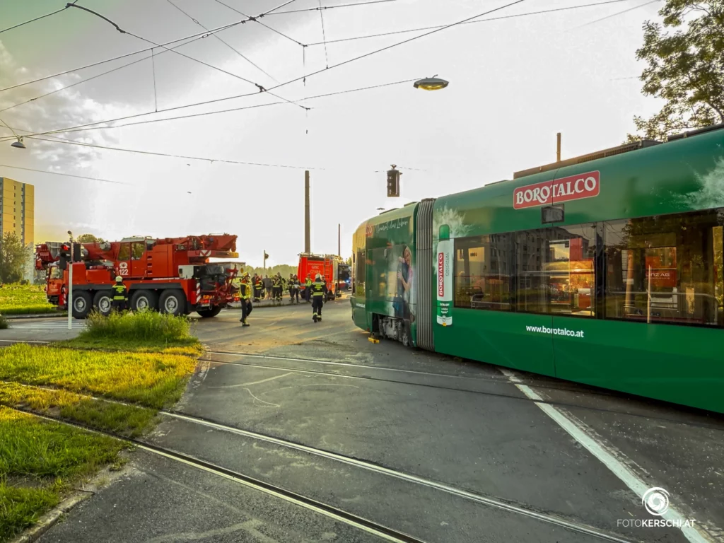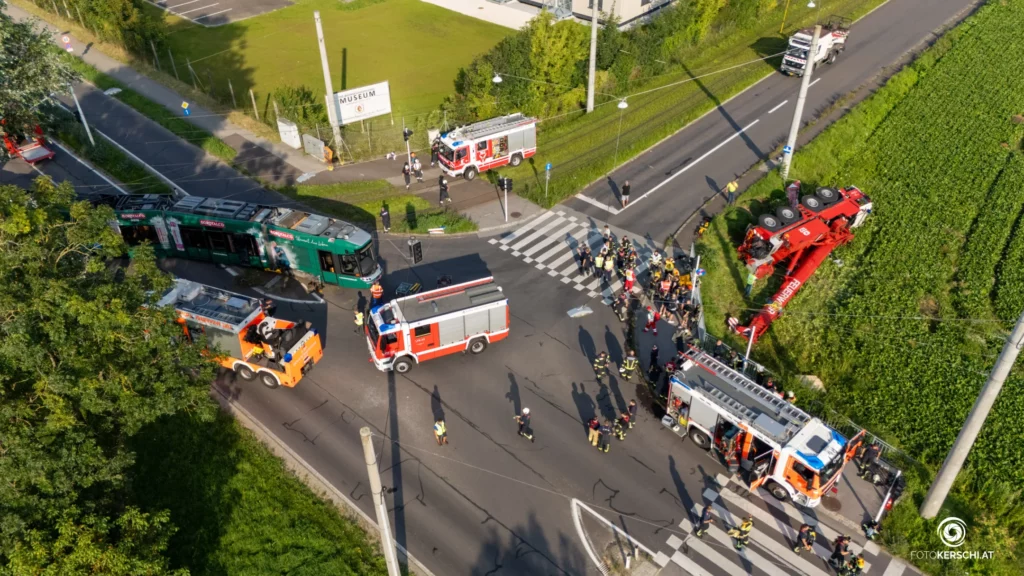 TEAM FOTOKERSCHI / WERNER KERSCHBAUMMAYR: Linz, Sonntag früh gegen 6:30 Uhr – Im Zuge der Bergungsarbeiten nach einem Zusammenstoß zwischen einer Straßenbahn und einem Pkw auf der B1 Wiener Straße in Linz kam es zu einem schweren Zwischenfall mit einem Bergekran der Berufsfeuerwehr Linz.Während der Vorbereitungsarbeiten zur Wiedereingleisung der Straßenbahn setzte sich ein 50-Tonnen-Kraftfahrzeugkran aus bislang ungeklärter Ursache in Bewegung, stürzte eine Böschung hinab und kam in einem angrenzenden Feld seitlich zum Liegen. Zwei Feuerwehrmänner der Berufsfeuerwehr Linz wurden dabei unter dem Fahrzeug eingeklemmt. Der Kranführer konnte sich selbstständig aus dem Führerhaus befreien. Die beiden eingeklemmten Einsatzkräfte wurden von ihren Kameraden binnen kürzester Zeit unter dem Kran herausgerettet.