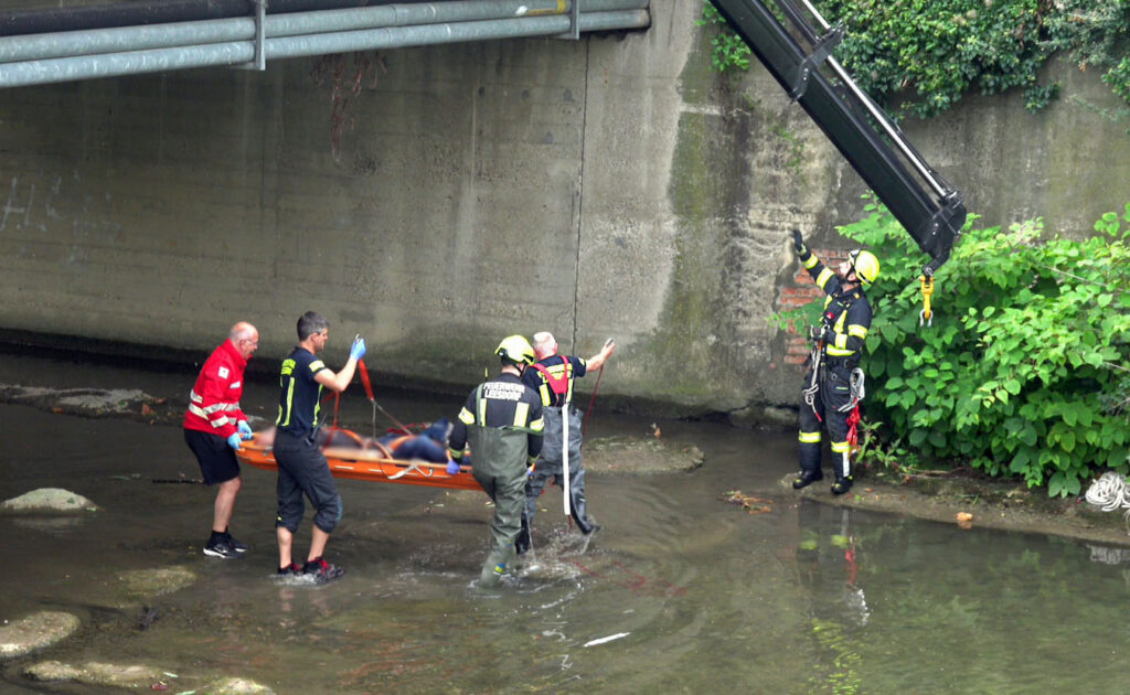 Ein Mitarbeiter der Bereichsalarmzentrale Baden wird auf ein sonderbares Verhalten einer Person im Flussbett des Schwechat-Flusses aufmerksam und alarmiert die Einsatzkräfte.Mit dem Alarmmeldebild T2 Menschenrettung Wasser wurden am Freitagvormittag den 29. August 2025 die Freiwillige Feuerwehr Baden-Leesdorf und laut Alarmstufe auch die FF Baden Weikersdorf in den Ortsteil Leesdorf alarmiert.Durch Zufall wurde der diensthabende Disponent der Bereichs-Alarmzentrale BADEN, die sich auch im Feuerwehrhaus Baden befindet, auf einen Mann im direkt angrenzenden Flussbett der Schwechat aufmerksam. Die Person lag im Bereich der dortigen Trudo-Exner Brücke im Wasser und verhielt sich sonderbar. Eine Verletzung des Mannes konnte nicht ausgeschlossen werden. Zum Glück ist der Wasserstand zurzeit sehr niedrig. Noch bevor die ersten Einsatzkräfte im Feuerwehrhaus eintrafen, wurde der zufällig anwesende Feuerwehrmann BSB Andreas Kügerl (auch Gruppenkommandant Sonderdienst Tauchdienst Zug Süd) zum Ersthelfer und kletterte ins Flussbett zu dem Mann.