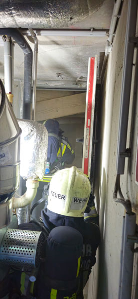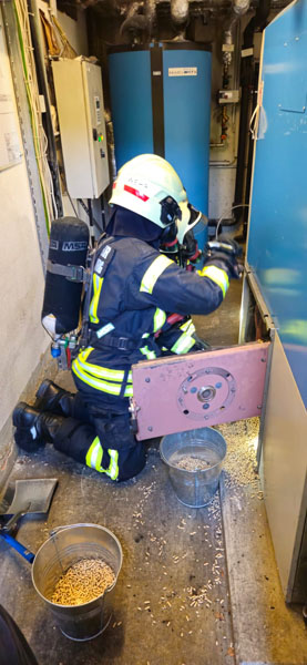 Ein Atemschutztrupp der Feuerwehr erkundete den betroffenen Bereich und vermutete einen Brand im frisch befüllten Pelletslagerraum. In mehreren angrenzenden Wohnungen war bereits ein deutlich wahrnehmbarer Brandgeruch sowie Rauchaustritt aus Lüftungsschächten festzustellen. Die Bewohner der betroffenen Wohnungen wurden vorsorglich evakuiert und vom Roten Kreuz Klosterneuburg betreut.