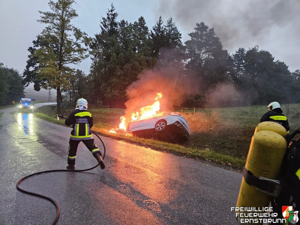 Am Donnerstagmorgen, dem 25. September, wurden die Freiwilligen Feuerwehren Ernstbrunn und Steinbach zu einem Fahrzeugbrand auf der Landesstraße Richtung Klement, beim oberen Kalkwerk, alarmiert.Ein Autofahrer kam mit seinem Wagen von der Fahrbahn ab, rutschte in den Straßengraben und prallte gegen ein Betonrohr. In Folge des Aufpralls geriet das Fahrzeug in Brand. Bereits auf der Anfahrt erhielten die Einsatzkräfte die Information: „PKW in Vollbrand, keine Person mehr im Fahrzeug.“