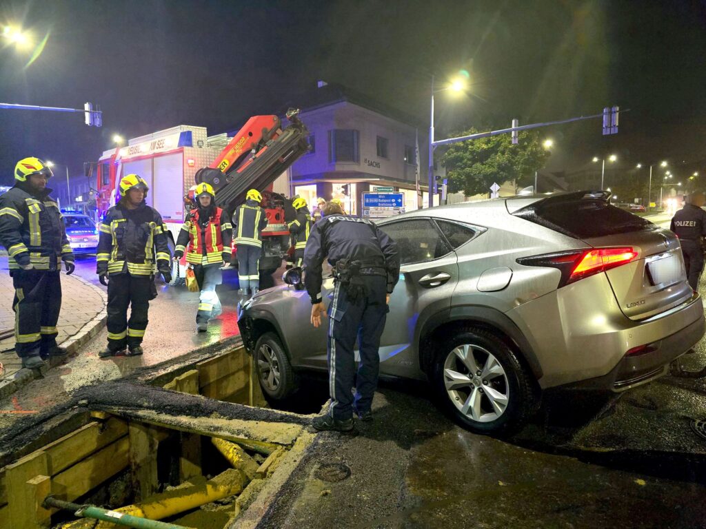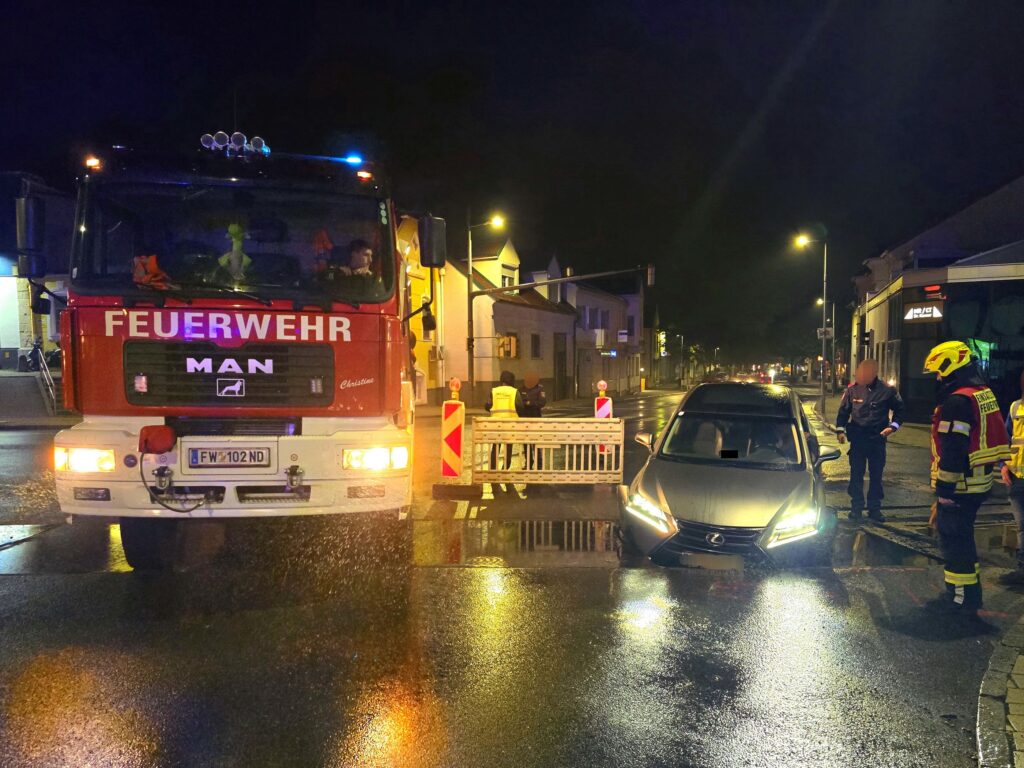 mit der Vorderachse seines Fahrzeuges in die Künette der Nachtbaustelle an der BH-Kreuzung in Neusiedl am See. Verletzt wurde glücklicherweise niemand.