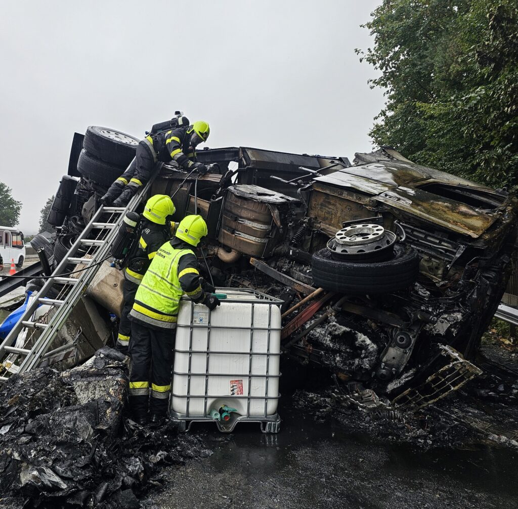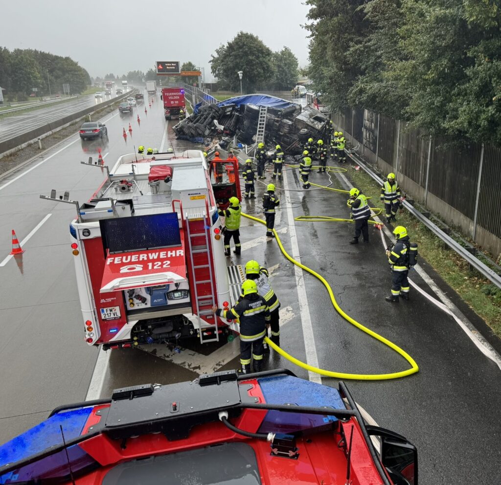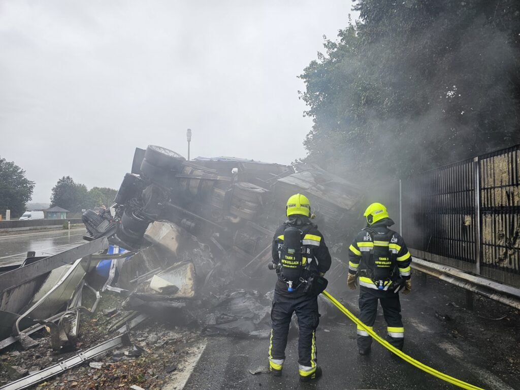 Gegen 11:30 Uhr kam es auf der A2 Südautobahn im Gemeindegebiet Wernberg, im Bereich des Rastplatzes Sternberg in Fahrtrichtung Klagenfurt, zu einem schweren Verkehrsunfall mit einem Sattelzug.Aus bislang ungeklärter Ursache geriet das Fahrzeug ins Schleudern und kippte in weiterer Folge im Bereich der Parkplatzeinfahrt um. Dabei fing die Zugmaschine durch die Wucht des Aufpralls sofort Feuer. Der Lenker konnte sich glücklicherweise noch rechtzeitig aus demFührerhaus befreien und blieb nahezu unverletzt.Die Landesalarm- und Warnzentrale Kärnten alarmierte daraufhin umgehend die örtlich zuständige Feuerwehr Wernberg sowie die Feuerwehr Velden am Wörthersee. Zusätzlich wurde die Hauptfeuerwache Villach mit mehreren Tanklöschfahrzeugen zur Unterstützung durch den Einsatzleiter der FF Wernberg BI Martin Unterüberbacher, angefordert.