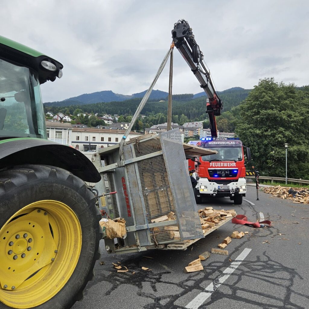 Ein mit Holzscheiter beladener Anhänger kippte am Vormittag des 09.09.2025 in der Frachtenstraße „Stolz Kurve“ in Mürzzuschlag um. Der Anhänger wurde mittels WLF-Kran wieder aufgestellt, das Ladegut wurde mit Unterstützung des DLZ Mürzzuschlag von der Fahrbahn entfernt und wieder auf den nahezu unbeschädigten Anhänger geladen.