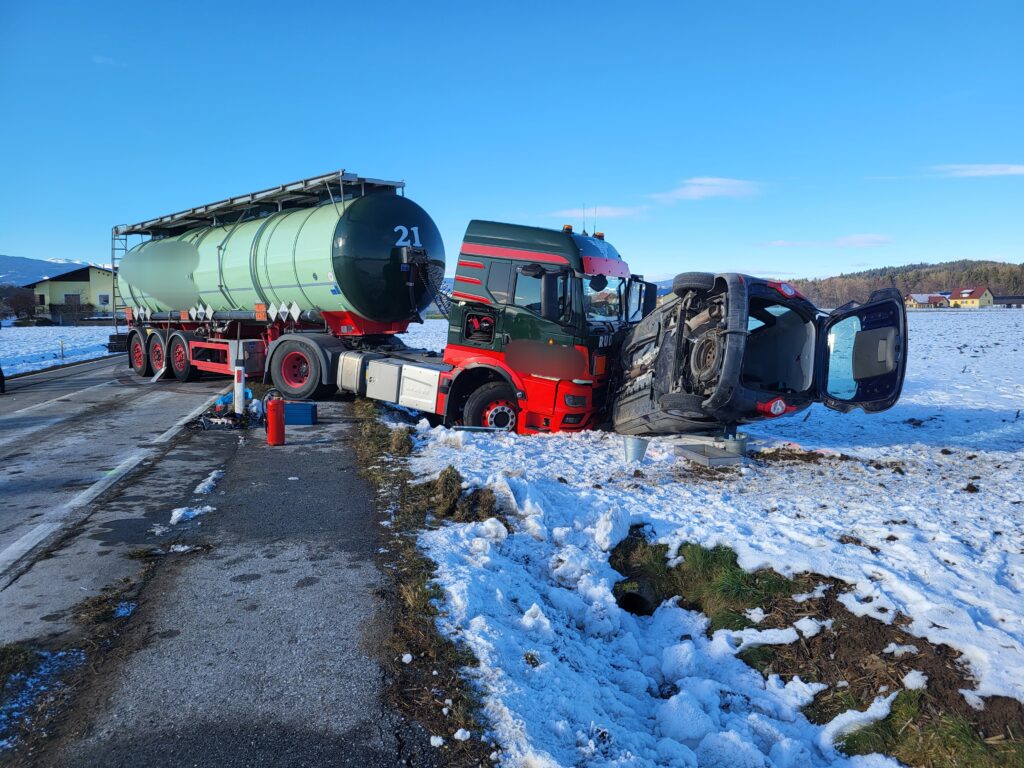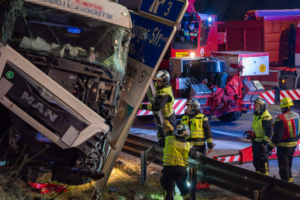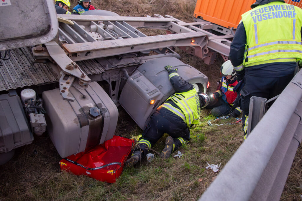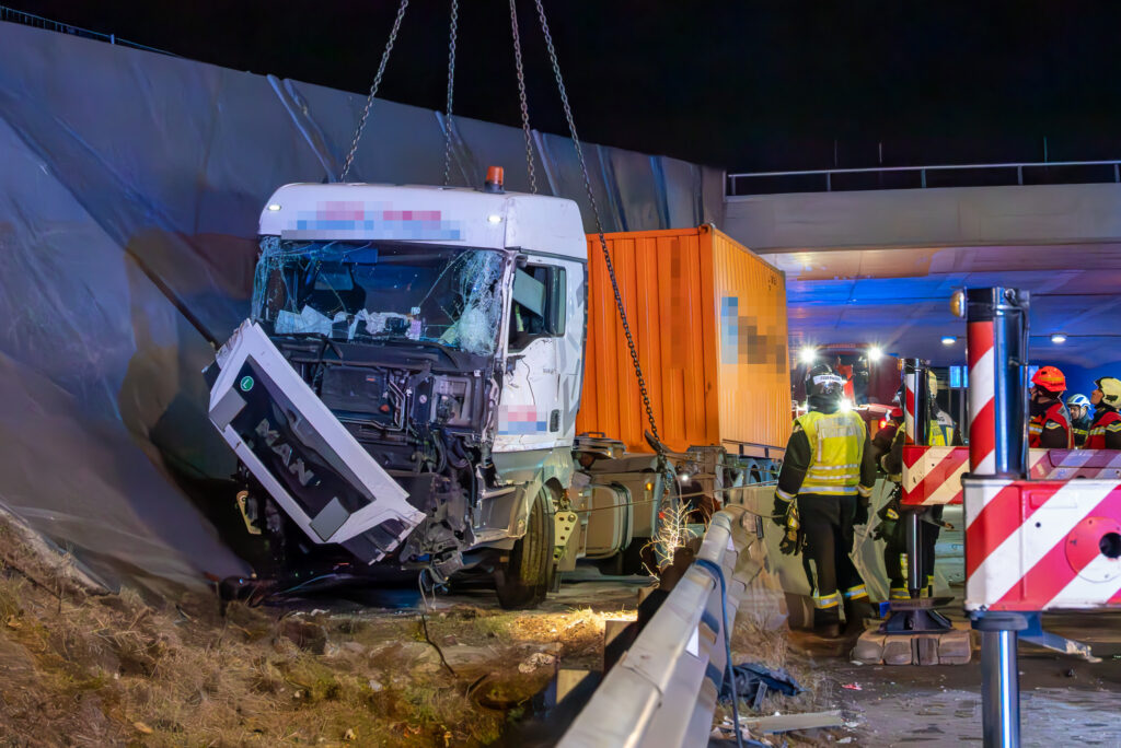 Der Fahrer eines LKW verlor die Kontrolle über sein Fahrzeug und kam in weiterer Folge von der Fahrbahn ab. Das Sattelgespann kollidierte mit der Tunnelwand und kam schließlich hinter der Betonleitwand sowie der Leitschiene zum Stillstand. Beim Eintreffen der Einsatzkräfte befand sich der Fahrer noch schwer verletzt im Fahrerhaus. Der Patient wurde mithilfe eines Spineboards schonend gerettet und zur weiteren Versorgung dem Rettungsdienst übergeben. Anschließend wurde der Schwerverletzte mit dem Notarzthubschrauber „Christophorus 9“ in ein Krankenhaus geflogen, woraufhin die Bergearbeiten beginnen konnten.