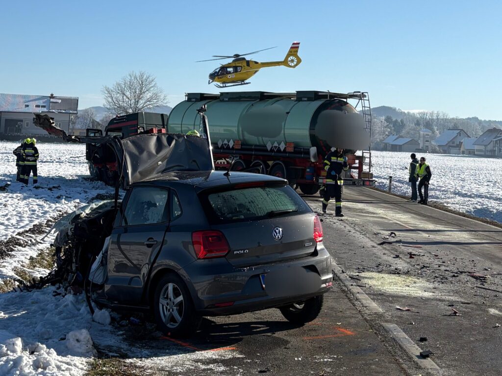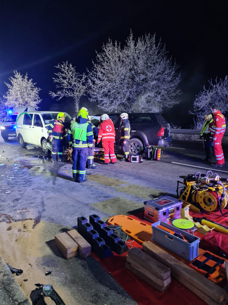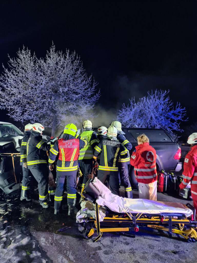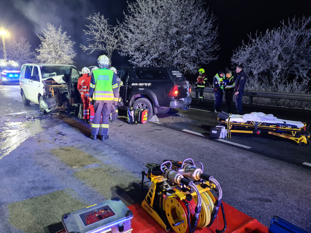 PREGARTEN/PREGARTSDORF, 29.12.2025. Zu einem schweren Frontalzusammenstoß zweier Fahrzeuge kam es am Donnerstagabend, 29. Dezember 2025, auf der Gutauer Landesstraße (L1472) zwischen Pregartsdorf und Selker.Ein Pick-Up kollidierte frontal mit einem Kleinbus. Zwei Personen wurden bei dem Verkehrsunfall verletzt.