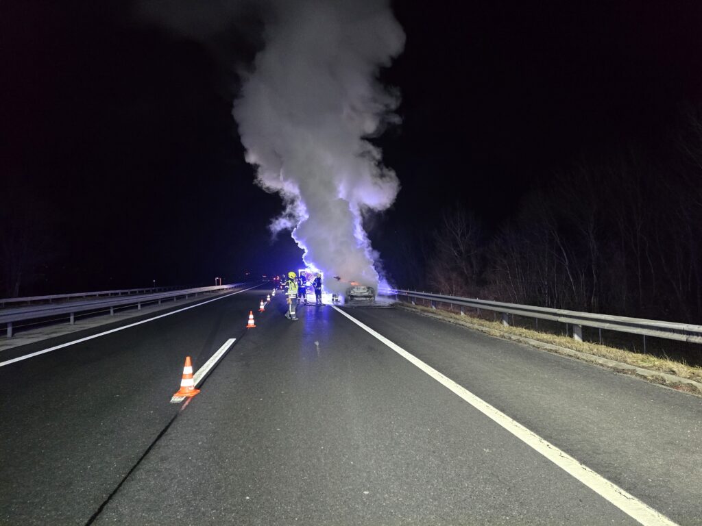 Heute Nacht, kurz nach Mitternacht wurde die FF Neufeld zu einem Fahrzeugbrand auf die A3 Richtung Wien alarmiert. Beim Eintreffen des Tanklöschfahrzeuges stand der PKW bereits in Vollbrand. Der bereits geschmolzene Kraftstofftank sowie der auslaufende, brennende Kraftstoff sorgten für eine enorme Hitzeentwicklung rund um das Fahrzeug.