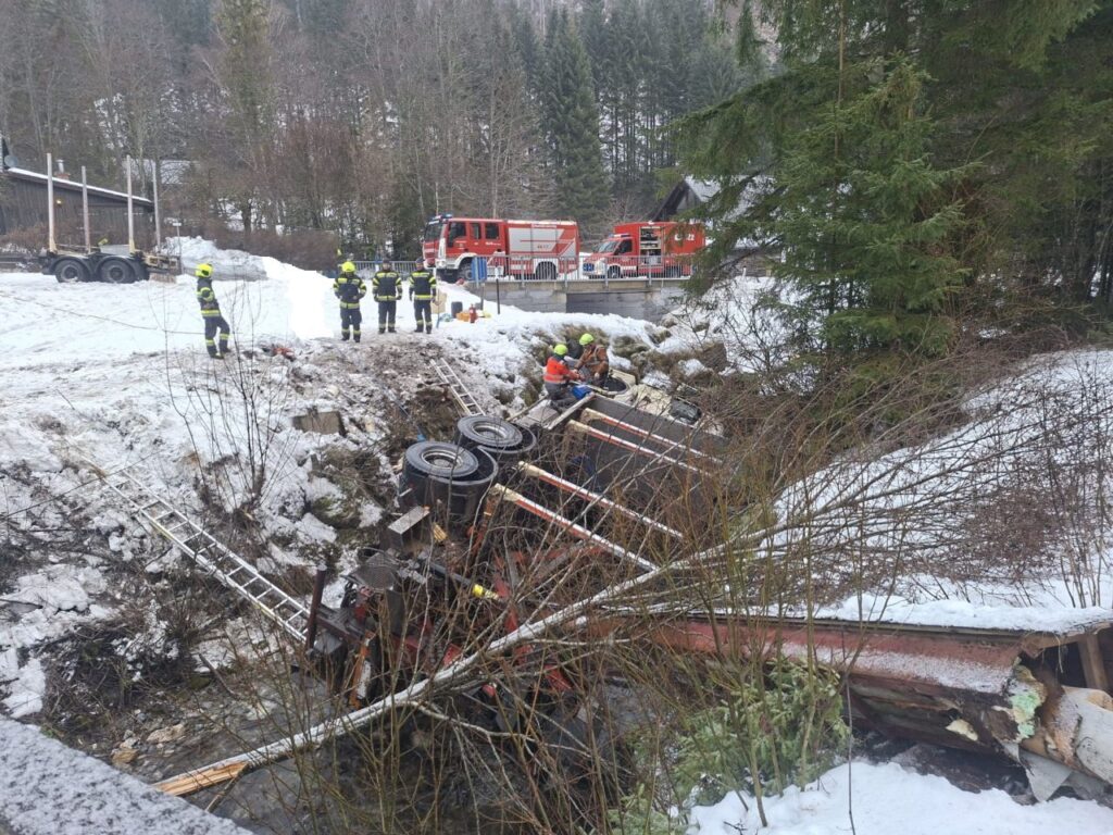 Am Donnerstag, 29.01.2026 kam ein Holztransporter von der Fahrbahn ab und stürzte in einen Bach. Mit leichten Verletzungen wurde der 33-Jährige Lenker in ein Krankenhaus eingeliefert. Gegen 4:15 Uhr war ein Holz LKW auf der L 113 in Dobrein in Fahrtrichtung Mürzzuschlag unterwegs. Auf Höhe Straßenkilometer 3,4 dürfte er vermutlich wegen Glatteis die Kontrolle über das Fahrzeug verloren haben. Er kam von der Fahrbahn ab, fuhr über eine abschüssige Wiese und kam in einem Bach seitlich liegend zum Stillstand. Der Lenker verständigte per Handy seinen Chef, der in der Folge die Rettungskette in Gang setzte. Nach der Erstversorgung wurde der Lenker mit leichten Verletzungen ins LKH Hochsteiermark, Standort Leoben, eingeliefert.