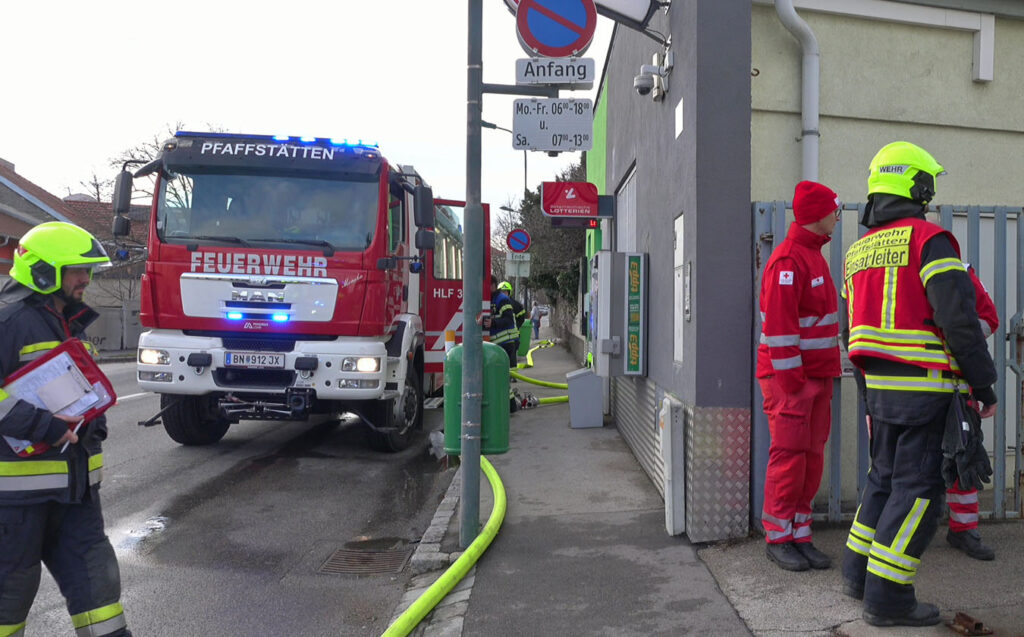 Wäre der Brand im Dachbereich eines Wohnhauses noch länger unentdeckt geblieben, so hätte es auch ganz anderes ausgehen können.Ein Bewohner wählte Samstagnachmittag (07.02.2026) den Notruf 122 der Feuerwehr, nachdem er zufällig aus dem Flachdach leichten Rauch aufsteigen sah.Daraufhin wurde die örtliche Freiwillige Feuerwehr Pfaffstätten kurz vor 15 Uhr zu einem Brandeinsatz B1 Rauchentwicklung beim Dach alarmiert. Um für die nähere Erkundung auf das betroffene Dach des zweistöckigen Wohnhauses aufsteigen zu können, mussten die Feuerwehrleute über das Flachdach des Nachbargebäude vorgehen, wo sie eine weitere Steckleiter aufstellen konnten. Neben einem leichten Rauchaustritt stellten sie mit der Wärmebildkamera eine starke Erwärmung direkt unter dem Blechdach im Bereich eines Außen-Rauchfangs fest. Diese war jedoch so hoch, dass man von einem Brand innerhalb des Flachdaches ausgehen musste. Sofort wurde eine Löschleitung aufgebaut und über die Bereichsalarmzentrale forderte der Einsatzleiter die FF Tribuswinkel mit weiteren Atemschutzgeräteträger, sowie die Polizei und Rettung nach.