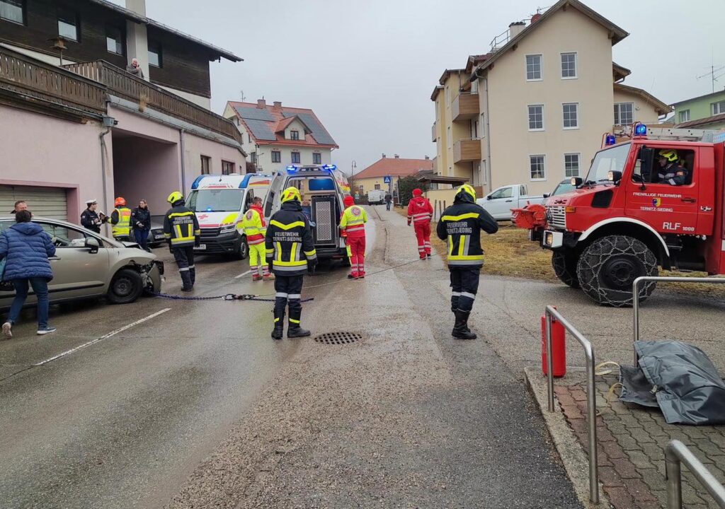 Am heutigen Dienstag (9. Februar), wurde die FF Puchberg am Vormittag mittels Vollalarm (Sirene, Pager & Handy) zu einem Verkehrsunfall „Unklare Lage“ ins Ortszentrum alarmiert. Als Zusatzinfo wurde über die BAZ mitgeteilt, dass sich noch eine Person im Fahrzeug befinden sollte. Kurz nach der Alarmierung konnten das HLF-A 3 sowie das Kommandofahrzeug ausrücken, gemäß Alarmplan „T2“ wurde ebenfalls die FF Ternitz-Sieding mit der zweiten Bergeschere hinzugezogen. Beim Eintreffen bot sich folgendes Bild; durch einen vorangegangenen Auffahrunfall prallte ein PKW gegen eine Hausmauer, die Lenkerin war noch im Fahrzeug und konnte dieses selbständig nicht verlassen. Nach Rücksprache mit dem anwesenden Rettungsdienst wurde eine schonende Rettung aus dem Fahrzeug vorbereitet. Dazu musste der PKW mittels zweier Seilwinden von der Wand weggezogen werden um einen Zugang zur Patientin zu ermöglichen.