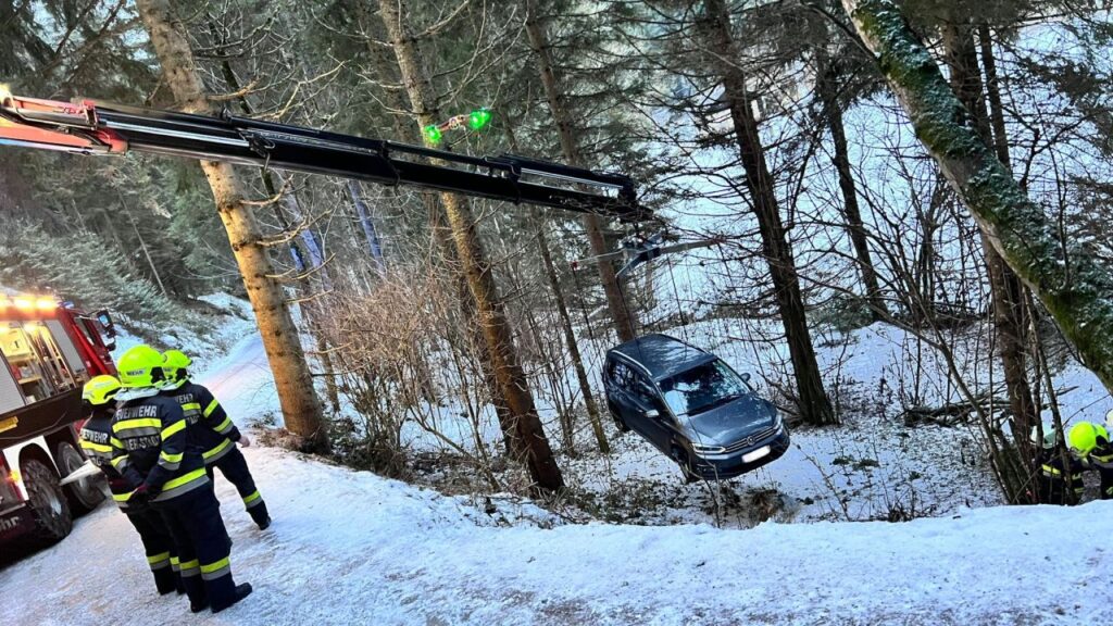 Ein PKW kam aufgrund widriger Verhältnisse auf einer spiegelglatten Fahrbahn, trotz angelegter Schneeketten, ins Rutschen und stürzte in weiterer Folge über die Böschung in den Wald.