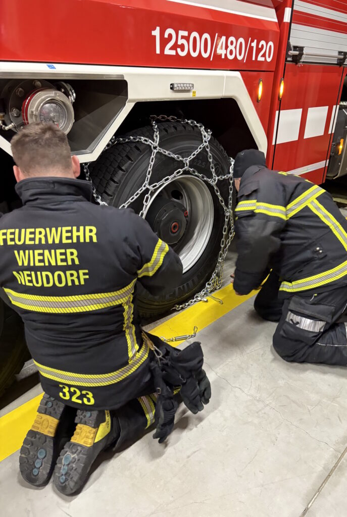 Wie zahlreiche Feuerwehren in ganz Österreich steht auch die Freiwillige Feuerwehr Wiener Neudorf seit Beginn der prognostizierten Schneefälle bereits mehrfach im Einsatz. So mussten unter anderem ein von der Fahrbahn abgekommener Pkw geborgen sowie mehrere Bäume, die der Schneelast nicht standgehalten haben, mittels Motorkettensäge entfernt werden. Um auch bei winterlichen Straßenverhältnissen jederzeit einsatzbereit zu bleiben, wurden von den ehrenamtlichen Kräften zahlreiche Feuerwehrfahrzeuge vorsorglich mit Schneeketten ausgerüstet.