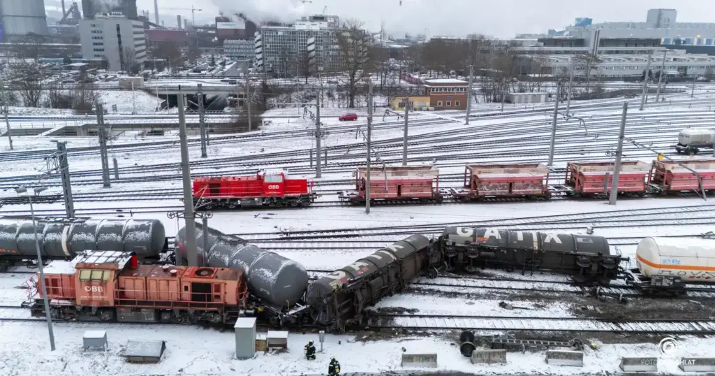 TEAM FOTOKERSCHI / WERNER KERSCHBAUMMAYR Linz am 16.02.2026 – Bei einem schweren Unfall im Bereich des Verschiebebahnhofs Linz West sind heute Morgen mehrere Waggons eines Güterzuges entgleist und umgestürzt. Gegen 7.30 Uhr wurden Feuerwehr, Rettung und Polizei zu einem Großeinsatz im Industriegebiet an der Turmstraße alarmiert. Im Zuge von Verschubarbeiten sprangen mehrere Waggons eines Güterzuges aus den Gleisen und kippten um. Nach ersten Informationen wurde bei dem Vorfall niemand verletzt.Die betroffenen Waggons waren zum Unfallzeitpunkt leer, jedoch noch nicht gereinigt und zuvor mit verschiedenen Gasen beladen. Daher mussten die Einsatzkräfte umfangreiche Sicherungsmaßnahmen treffen. Neben der Berufsfeuerwehr Linz stand auch die Freiwillige Feuerwehr Ebelsberg zur Unterstützung im Einsatz. Ein besonderes Augenmerk lag auf dem Erden der Oberleitungen, um die Sicherheit bei den weiteren Arbeiten zu gewährleisten.Nach Angaben von Einsatzleiter Roland Hieslmayr ist der entstandene Sachschaden beträchtlich. Neben den Waggons wurden auch Masten beschädigt. Die Arbeiten zur Bergung und Sicherung der Unfallstelle werden voraussichtlich noch einige Zeit in Anspruch nehmen.Die ÖBB meldete eine Sperre der Weststrecke, wodurch es zu Verzögerungen im Zugverkehr kam.