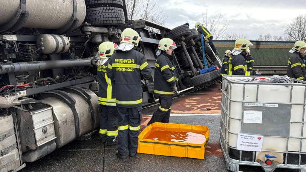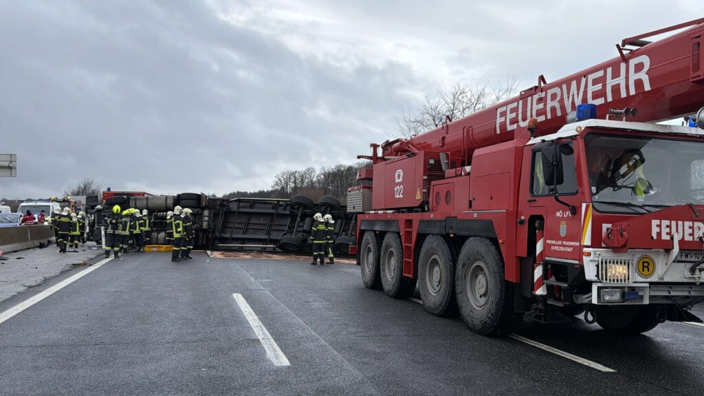 DOKU NÖ: Am Faschingsdienstag, dem 17. Februar 2026, ereignete sich in den frühen Morgenstunden ein schwerer Verkehrsunfall auf der Autobahn A1 in Fahrtrichtung Salzburg, im Bereich Böheimkirchen. Aus bislang ungeklärter Ursache kam es zu einer Kollision zwischen zwei Lastkraftwagen. Dabei kippte ein LKW um und kam quer über alle Fahrspuren der Autobahn zum Liegen. Der zweite beteiligte LKW kam entgegen der Fahrtrichtung zum Stillstand. Aufgrund der ersten Meldungen wurde von einer möglichen Menschenrettung ausgegangen. Die Feuerwehren Böheimkirchen und St. Pölten, der Rettungsdienst sowie die Polizei wurden umgehend alarmiert. Beim Eintreffen der Einsatzkräfte war ein LKW-Lenker in seinem Fahrzeug eingeschlossen und musste über die Windschutzscheibe aus dem Führerhaus befreit werden. Der verletzte Lenker wurde nach der Erstversorgung vor Ort durch den Rettungsdienst mit Verletzungen unbestimmten Grades in ein Krankenhaus transportiert.. Bei einem der Unfallfahrzeuge wurde der Treibstofftank beschädigt, wodurch Betriebsmittel austraten.