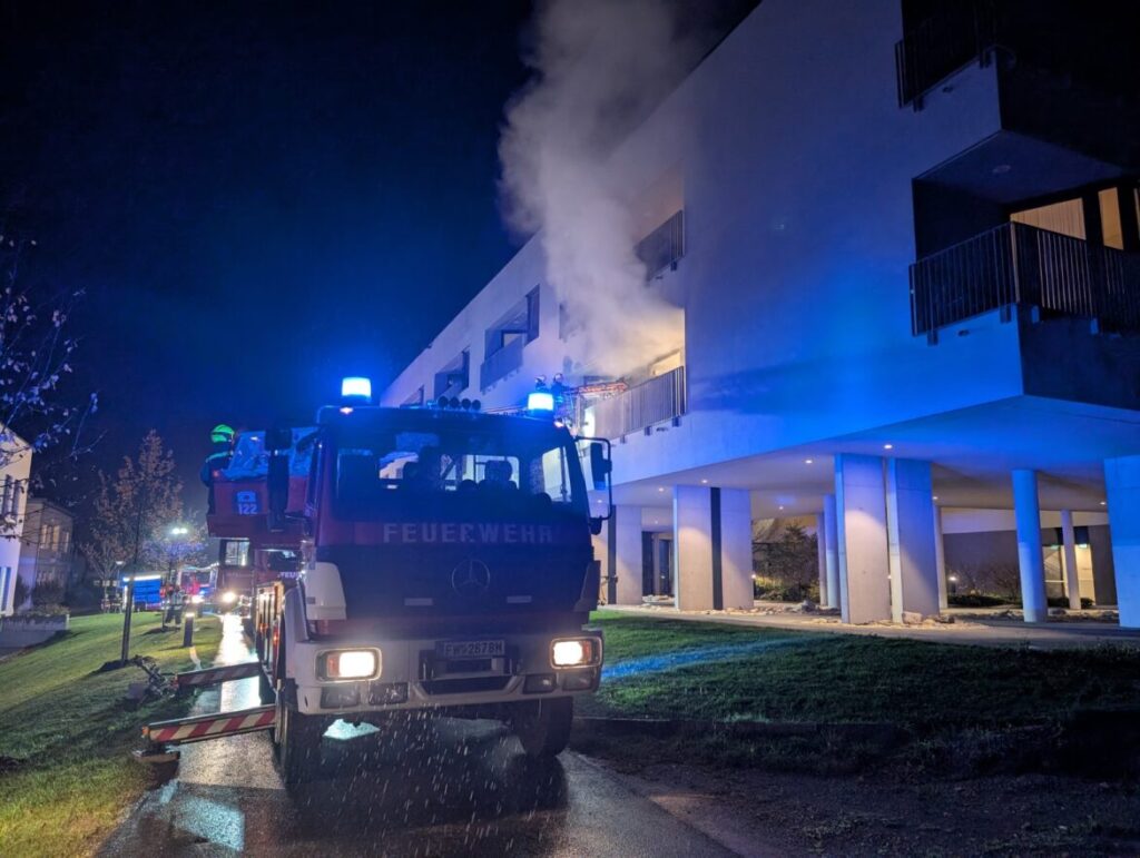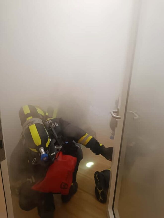 Während ein Atemschutztrupp mittels Fluchthauben betroffene Heimbewohner in Sicherheit brachte, wurde parallel eine Person über die Drehleiter gerettet und die Personensuche fortgesetzt.