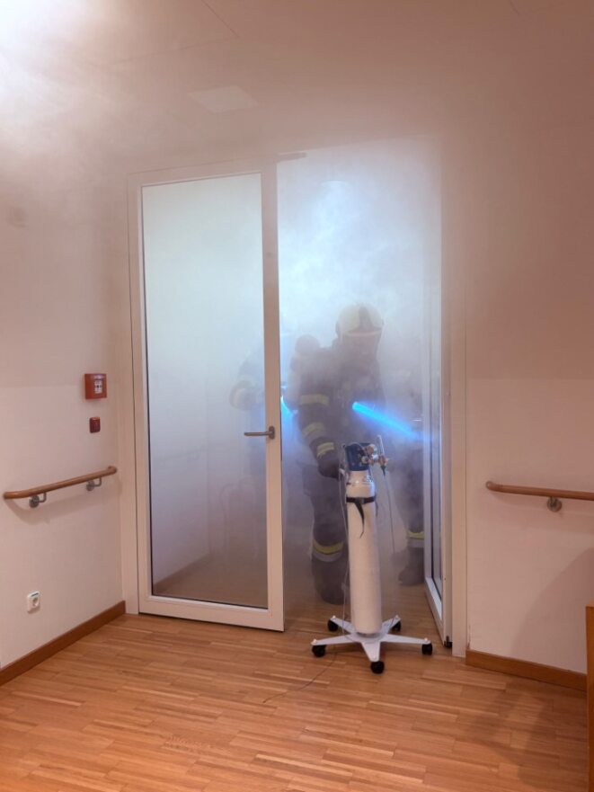 Um 17.10 Uhr erfolgte der Übungsalarm durch Auslösung der Brandmeldeanlage, umgehend rückte die Einsatzleitung zum betroffenen Objekt aus. Die Erkundung ergab eine starke Rauchentwicklung im 1. Obergeschoss, wobei sämtliche Zimmer im betroffenen Brandabschnitt belegt und sich auch Besucher im Gebäude befanden.