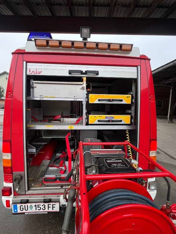 - Hochdruck Löschanlage angetrieben über einen eigenen Benzinmotor, mit Schlauchhaspel und Schaumzumischung. Löschwassertank 400 Liter.